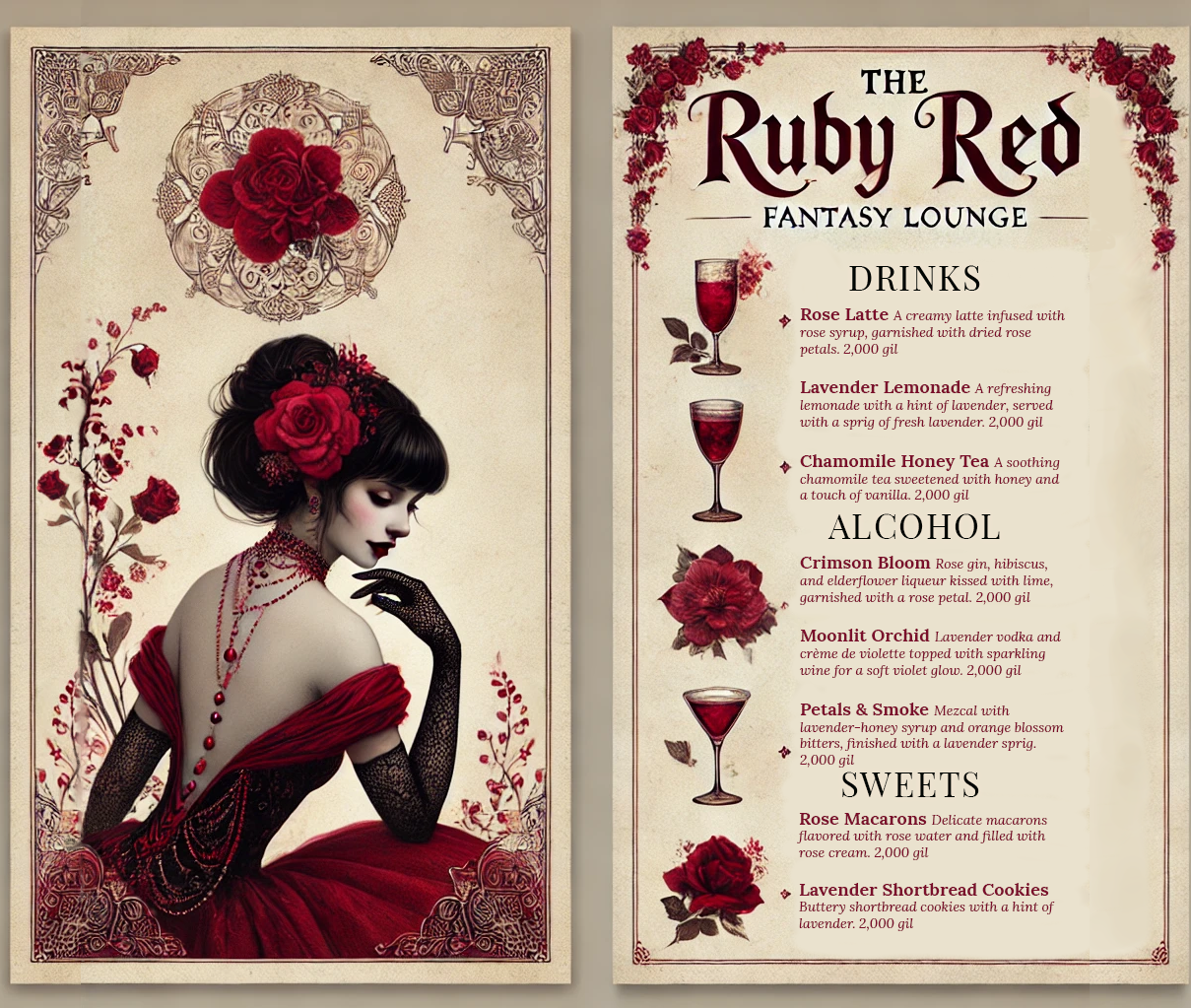 A roleplay lounge in Final Fantasy XIV with a sultry, floral theme. Here you’ll find a cozy place to relax, enjoy crafted drinks, listen to live jazz or bard performances, and spend time with our courtesans, the Rose Petal Cakes.Whether you’re meeting friends, striking up new conversations, or simply soaking in the atmosphere, Ruby Red Lounge is your haven to unwind and indulge. Step inside and let the night bloom around you.We're here to make your night unforgettable.